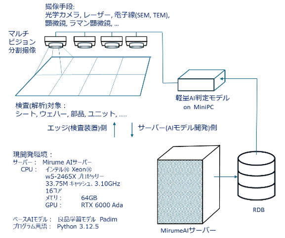 電子顕微鏡や光学カメラから取得した画像を約25mm単位で分割し、各領域をMiniPCに搭載された軽量AIモデルで個別推論します。推論結果はエッジ側で一次判定された後、サーバー経由で中央RDBへ集約され、モデル改良やトレンド分析に活用されます。