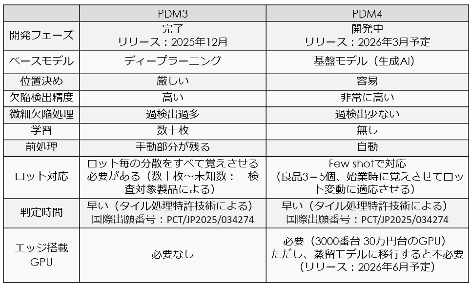 次世代モデル「PDM4」では、Few-shot学習、位置ずれ耐性、微細欠陥の精密識別などが進化し、
