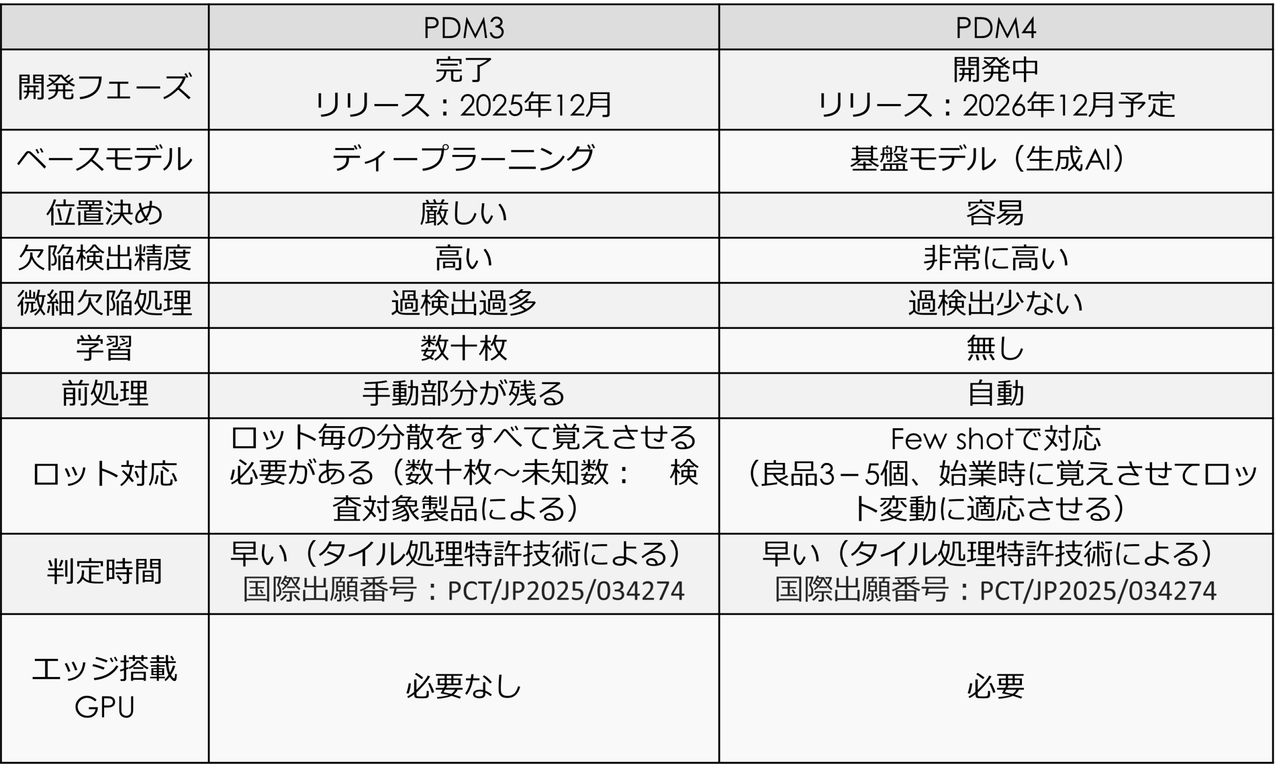 次世代モデル「PDM4」では、Few-shot学習、位置ずれ耐性、微細欠陥の精密識別などが進化し、