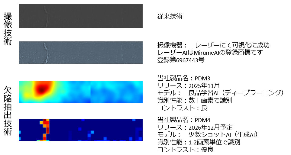 MirumeAIは、20〜30μmの微細なキズや、従来AIが過剰反応してしまうノイズ、